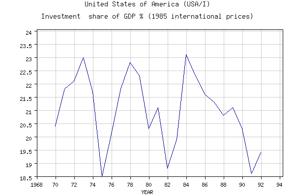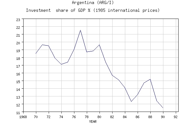 L’Argentine faisait partie des pays les plus riches du monde à la fin du XIXème siècle avant que des réformes politiques, au début du XXème, ne la plonge dans une profonde crise économique. Le graphique suivant représentant le taux d’investissement par rapport au PIB du pays dans la période 1970-90 illustre parfaitement l’économie argentine au XXème siècle. En effet, le taux d’investissement suit une pente décroissante.