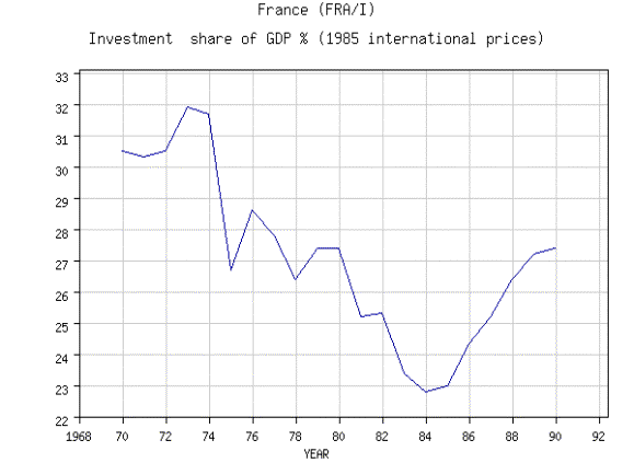 En effet, mis à part la reprise de 1984-85, le taux d’investissement est sur une pente décroissante durant la majeure partie des années 1970 et début 1980 ainsi que tout au long du début des années 1990 (non présent sur l’illustration). Cette insuffisance ou ce retard au niveau de l’investissement s’explique par trois facteurs.
