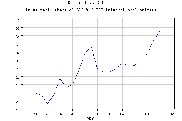 Ce développement économique sera sans précédent et, dans les trente années suivantes, le taux de croissance annuel moyen du PIB a été l’un des plus élevé du monde (8,6 %). Le taux d’investissement dans ce pays a également bénéficié de cette croissance rapide et, sur la période représentée par le graphique suivant, ce taux offre une courbe d’allure croissante (malgré quelques fluctuations engendrées par les différentes crises mondiales) passant de 19 % en 1972 à 37 % du PIB en 1990.